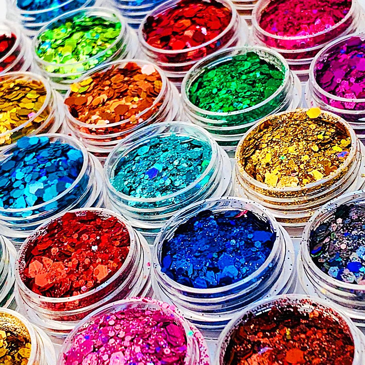 Ultra fine glitter colors, holographic glitter powder for tumblers, arts and craft glitter, iridescent glitter for epoxy resin, cosmetic glitter for body nail face hair eyeshadow makeup.